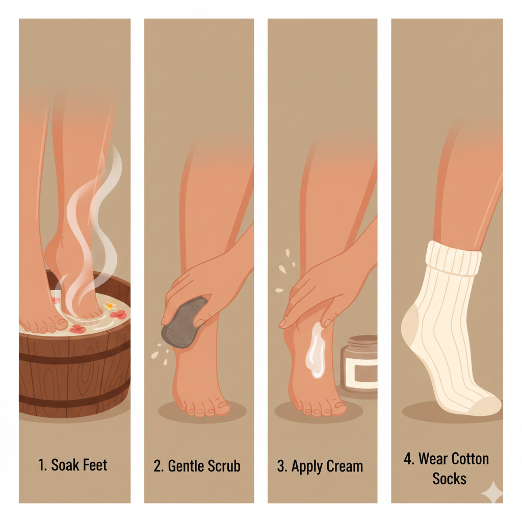 | Moderate | गहरी लाइन्स, peeling, white/gray flakes | Soak + scrub + thick cracked heel cream |