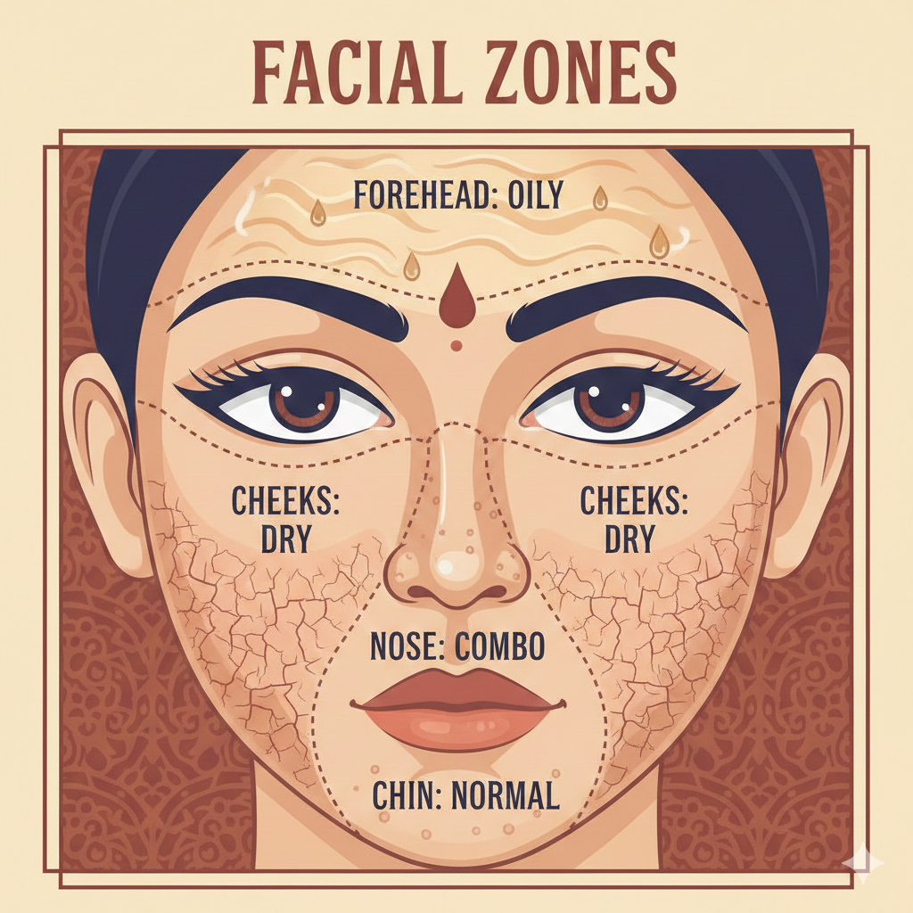 एक आसान टेस्ट: सुबह चेहरा धोएं, बिना कुछ लगाए दो घंटे बाद टिश्यू पेपर पूरे चेहरे पर दबाएं। अगर पेपर पर तेल के धब्बे दिखें – ऑयली। बिल्कुल सूखा रहे – ड्राई। सिर्फ टी-ज़ोन वाला हिस्सा ऑयली – कॉम्बिनेशन।